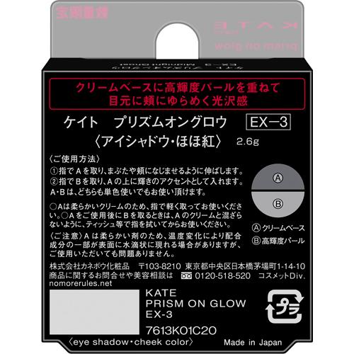 お店TOP>化粧品>メイクアップ>アイシャドウ>アイシャドウ>ケイト プリズムオングロウ EX-3 Midnight Ghost (2.6g)商品区分:化粧品【ケイト プリズムオングロウ EX-3 Midnight Ghostの商品詳細】●クリームベース*高輝度パール●目元に頬にゆらめく光沢感●アイシャドウ・ほほ紅●カラー名:Midnight Ghost【成分】タルク、オクチルドデカノール、イソステアリン酸水添ヒマシ油、リンゴ酸ジイソステアリル、セルロース、パルミチン酸デキストリン、トリ(カプリル酸/カプリン酸)グリセリル、マイカ、ジステアリン酸Al、ワセリン、ラウロイルグルタミン酸ジ(オクチルドデシル/フィトステリル/ベヘニル)、水添ポリイソブテン、ステアロイルグルタミン酸2Na、水酸化Al、ミリスチン酸亜鉛、エチルパラベン、メチルパラベン、デヒドロ酢酸Na、(+/-)グンジョウ、シリカ、ラウロイルアスパラギン酸Na、塩化亜鉛、酸化チタン、酸化鉄、トリイソステアリン酸イソプロピルチタン、銀、酸化スズ、ホウケイ酸(Ca/Al)、合成フルオロフロゴパイト、赤202、赤226【注意事項】・傷、はれもの、湿疹等異常のあるところには使用しないでください。
